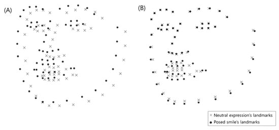 For the 3D facial landmark intensity estimation, we propose a new landmark-based displacement estimation method that resolves issues with incorrect displacement measurements. The proposed method has a contribution that it is capable of revising incorrect displacements caused by person-specific appearances, head movements, and rotations. Person-specific appearance problems occur because different people have different sizes and shapes of eyes, noses, and mouths, while some people have grimaces or smiles, even in their neutral state. In this study, the person-specific appearance problem is solved by measuring the displacement of smile expression landmark using the landmark of neutral expression as a basis. Moreover, as shown in Figure 3, when measuring facial landmarks of neutral expressions, posed and spontaneous smiles, the head position, and orientation of each expression were different from one another. Therefore, the 3D landmarks were required to be aligned to measure changes in each landmark. We used Sorkine et al.’s rigid motion computation to align the landmark sets in both expressions []. The aligning process of the two landmark sets is shown in Algorithm 1. The example of aligning the landmark sets of the expressions are shown in Figure 4. Through the processes above, we measured the changes of each landmark every frame and compared the facial movements of each area. As a result of aligning about 250,000 pairs of 57 subjects’ smiles and neutral expressions using rigid motion computation, the mean of residual error between each pair of fiducial points was 0.062 mm. These fiducial points were predefined landmarks for aligning landmarks of smiles and neutral expressions. In Figure 2, landmarks corresponding to the 27, 28, 29, 30, 39, and 42 indexes were selected as fiducial points.