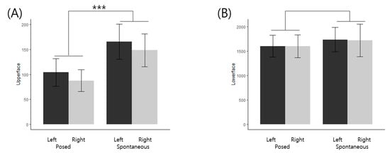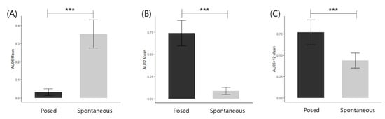 A repeated-measures ANOVA was computed with posed and spontaneous smile intensities according to AU06 (cheek raiser), AU12 (lip corner puller), and AU06+AU12 (see Table 3 and Figure 5). An AU06, located upper face, showed significantly higher intensities in spontaneous smiles than posed smiles. On the other hand, an AU12 corresponding to lower facial muscles had lower intensities in spontaneous smiles than posed smiles. The comparison of facial expression for the combination of AU06 and AU12 was identical to the pattern shown in AU12.