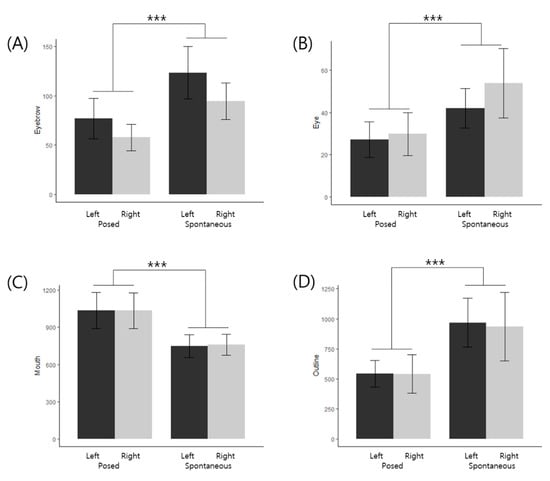 Classification of 3D landmarks in facial features to posed and spontaneous smiles with left and right faces. The difference in mean scores on posed/spontaneous smile intensities and left/right side of (A) Eyebrow. (B) Eye. (C) Mouth. (D) Outline. (*** P < 0.001).