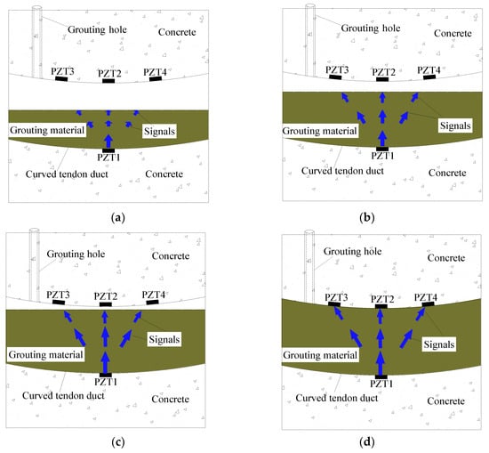 When the curved tendon duct reaches 100% grouting, the signals can be received by the sensors through the grouting material, as shown in Figure 1d. PZT 2, 3, 4 sensors can receive strong signals generated by the actuator PZT 1. Moreover, due to the characteristic of curve of the prestressed curved tendon duct, PZT 2 sensor located in the nearest position to PZT 1 actuator first receives the full signals when the curved tendon duct is fully compacted along the transmission direction between the sensors and actuator. Subsequently, PZT 3, 4 sensors gradually receive sufficient large signals as the longitudinal quality of the curved tendon duct increases.