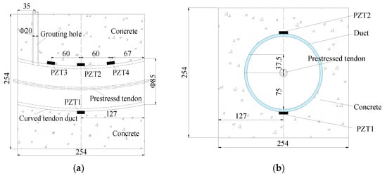 The test specimen mainly included the prestressed tendon, the plastic curved duct, the concrete, the grouting material, the PZT transducers, the lead wires and the BNC connectors. The concrete mixture included Portland cement PO 42.5, sands, gravel, and water. In order to improve the fullness and compactness of the prestressed curved tendon duct and enhance the fluidity of the grouting material, the grouting material adopted Portland cement PO 42.5 and the water-cement ratio of the pure cement slurry was 0.40. The grouting tube is PVC pipe. There were two transparent plastic plates bonded on the two sides of the test specimen to avoid the spillage of grouting material and ensure real-time detecting the quality level of the prestressed curved tendon duct. The specimen dimensions are shown in Figure 3. The specimen was a cube with a length of 254 mm on each side, the outer and inner diameters of plastic curved duct were 85 mm and 75 mm, respectively. Meanwhile, in order to facilitate the grouting of prestressed curved tendon duct, a PVC pipe with an inner diameter of 20 mm was adopted as the grouting pipe.