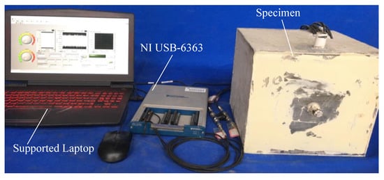 The experimental equipment included a specimen, a supported laptop and a NI USB-6363, as shown in Figure 4. The data acquisition board NI USB-6363 was utilized to produce the signals to the PZT 1 actuator and collect the signals from the PZT 2, 3, and 4 sensors.