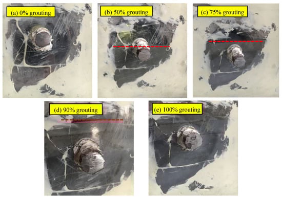 In practice, the grouting defect often occurs at the bending position of tendon ducts. Based on the actual engineering situation, this test designed five grouting conditions to simulate the different states, including 0%, 50%, 75%, 90%, and 100% grouting, as shown in Figure 5.