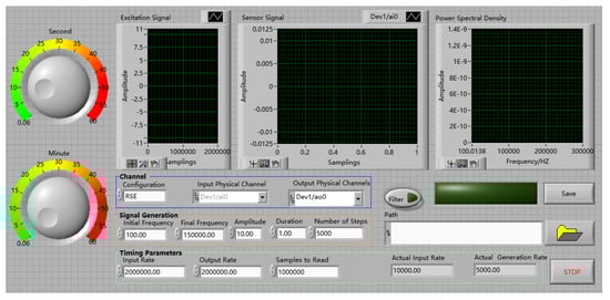 The data acquisition board NI USB-6363 was a 32 AI (16-Bit, 2 MS/s), 4 AO (2.86 MS/s), 48 DIO USB Multifunction I/O Device. When the NI USB-6363 was utilized to detect the test specimen, the actuator PZT 1 and the sensor PZT 2 or 3 or 4 were first connected to the device. Then opened the special test program, which was compiled by LabVIEW software. Its operating interface is shown in Figure 6. Next, selected the corresponding input and output channels on the program interface, and filled in a stable sweep signal as the excitation signal, including initial frequency 100 Hz, final frequency 150 kHz, amplitude 10 v, duration 1 s of one cycle, 5000 times of sweeps from initial frequency to final frequency, then determined input or output rate and the path to read the data. Finally, the program was executed to obtain the response signal of the test specimen, and the data was processed to evaluate the grouting quality of prestressed curved tendon duct.