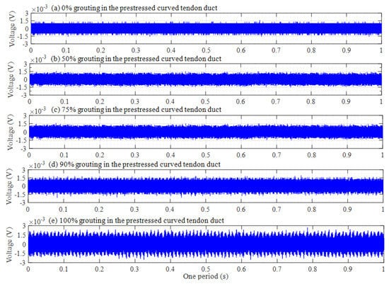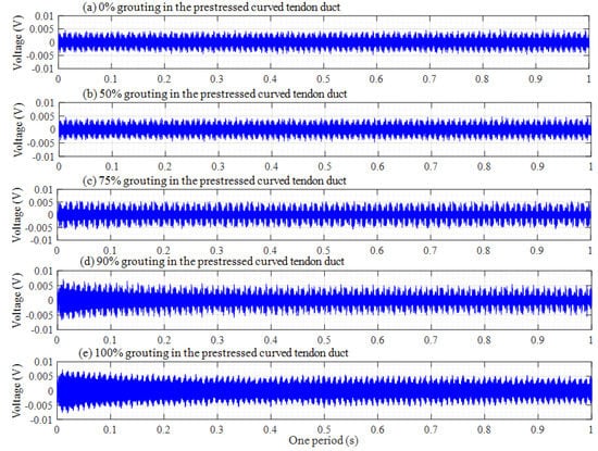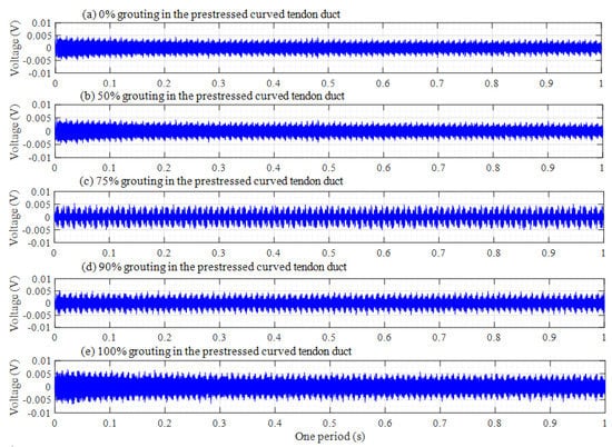 From the above time domain diagram, it can also be seen that the voltage amplitude decreases gradually with time during one period, which is especially obvious in the 100% grouting state. As is known to all, the stress wave response with lower frequency attenuates much less than that with higher frequency. Since the excitation signal was a sweep sine wave from a low frequency 100 Hz to a high frequency 150 kHz with respect to time, it can be known that the amplitude of the signal received by the PZT sensor decreases with the increase of frequency.