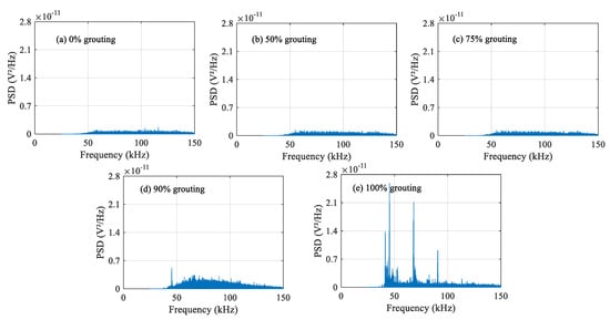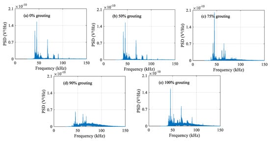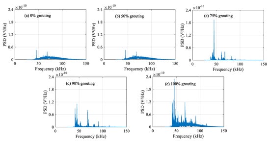 The damage level of structures can be determined by analyzing the attenuation degree of signals at different frequencies. The frequency-domain signals of each PZT sensor under different grouting states are shown in Figure 10, Figure 11 and Figure 12. Frequency-domain signals are transformed by Fourier transform from time-domain signals, so the power spectral density (PSD) energy is more obvious than the voltage signal received by the sensor. The PSD energy of PZT 2 in different grouting states is shown in Figure 10. The PSD energy of PZT 3 in different grouting states is shown in Figure 11. The PSD energy of PZT 4 in different grouting states is shown in Figure 12. Each plot represents the frequency-domain signal received by a sensor under five different grouting states, including 0%, 50%, 75%, 90%, and 100% grouting.