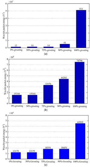 Compared with Figure 13a, Figure 13b shows that the wavelet packet energy of PZT 3 does not increase from 0% grouting case to half grouting case, when the grouting state comes to 75% and the wavelet packet energy of PZT 3 is almost doubled. The wavelet packet energy of PZT 3 also increases with the growth of grouting quality in the following grouting states. The reason for the difference is that the PZT 3 is the closest to the grouting hole, as the grouting process progresses gradually, the slurry of the tendon duct wall near PZT 3 will also increases, which will lead to an increase of the wavelet packet energy when the signals propagate through the wall of the duct. For the wavelet packet energy of PZT 4 in Figure 13c, it shows the similar trend with PZT 2. The wavelet packet energy of PZT 4 does not increase between 0% grouting and half grouting. When it comes to the grouting state between 75% and 90%, the wavelet packet energy gradually increases. Until it comes to 100% grouting, the wavelet packet energy of PZT 4 increases significantly.