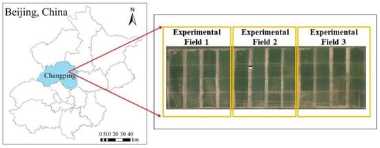 The research area is located in the National Precision Agriculture Research Demonstration Base in Xiaotangshan Town, Changping District, Beijing, China, at 40°00′–40°21′ N, 116°34′–117°00′ E. The area lies on open terrain at the junction of the Wenyu River alluvial plain and Yanshan mountain. The research area has a warm temperate continental monsoon climate, with an average annual temperature of about 16 °C and an average annual rainfall of about 54 mm. Most precipitation occurs in summer. The geographical location of the research area and the UAV sampling sites are shown in Figure 1. There were a total of 48 test plots in the sampling area, and each test plot measured 8 m in length and 6 m in width. The planted winter-wheat varieties were Zhongmai 175 (ZM175) and Jing 9843 (J9843). The winter wheat was treated with nitrogen fertilization of 0 kg N/hm2 (N1), 195 kg N/hm2 (N2), 390 kg N/hm2 (N3), and 780 kg N/hm2 (N4), and was subjected to three moisture levels: rainfall only, normal water (100 mm), and twice normal water (200 mm); the water irrigation times were 20 October 2014, 09 April 2015, 30 April 2015, and 22 May 2015.