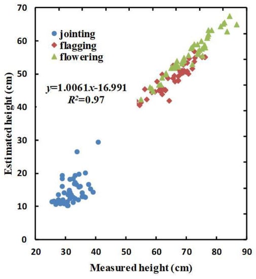 From Figure 3, it can be seen that there is a strong correlation between the measured values of plant height and the values of HCSM (R2 = 0.97; y = 1.0061x − 16.991), although the HCSM extracted during the three growth stages is less than the measured plant height. This suggests that the proposed model has a strong ability to predict winter-wheat plant height.