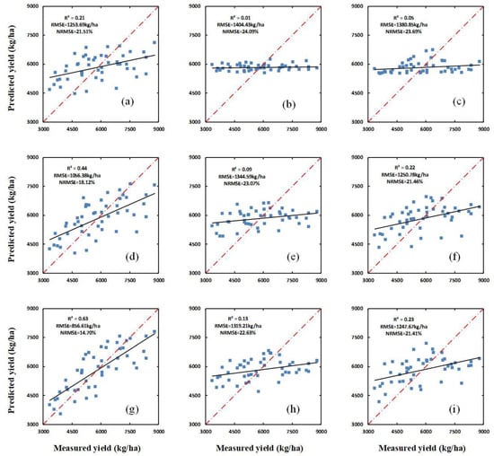 The relationships between the ground-measured and predicted values of winter-wheat yield at different growth stages based on partial least squares regression (PLSR). (a–c) show the results for SIs, a combination of SIs and H, and a combination of SIs and HCSM, respectively, at the jointing stage. (d–f) show the same as (a–c) for the flagging stage; and (g–i) show the same as (a–c) for the flowering stage.