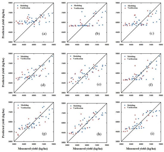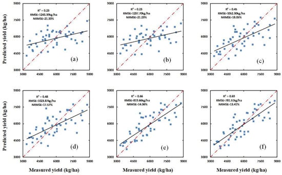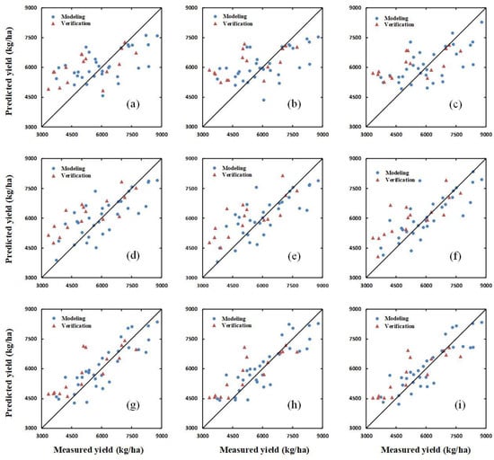Additionally, the verification dataset was used to verify the yield-prediction ability of the SIs, a combination of SIs and H, and a combination of SIs and HCSM, using the PLSR, ANN, and RF methods, respectively. The results of the verification for PLSR, ANN, and RF are shown in Figure 6, Figure 7 and Figure 8, respectively.