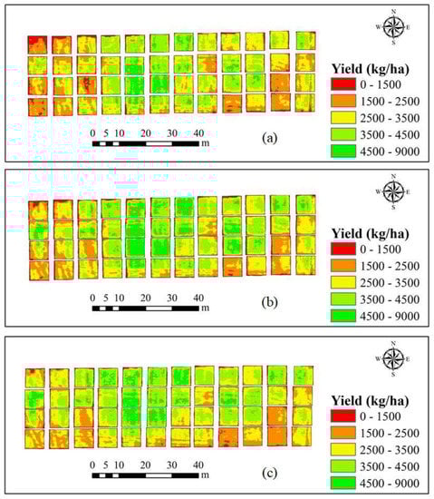 Maps showing the predicted yield of winter wheat in the 48 experimental plots obtained using PLSR and a combination of the SIs and HCSM. (a) Jointing stage, (b) flagging stage, and (c) flowering stage.