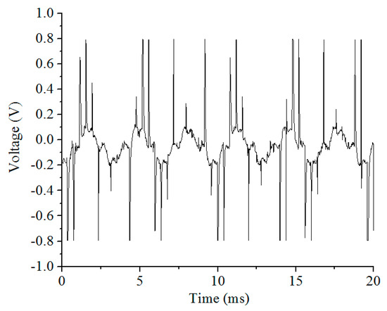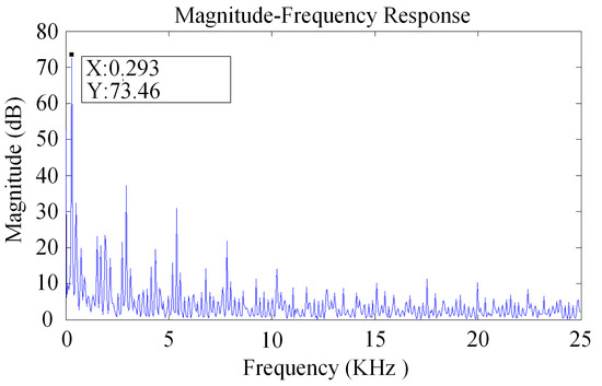 The drive interference test chart of a ball-disc rotor micro-gyro through the back electromotive force detection is shown in Figure 2. The drive interference frequency is about 0.3 KHz. At this time, the rotor speed is 18,000 rpm, and the oscilloscope sampling period is 50 KHz. Using MATLAB to process the data in Figure 2, spectral characteristics of the micro-gyro driving noise can be obtained. As shown in Figure 3, the fundamental frequency of the driving noise is 0.293 KHz, which basically matches the corresponding frequency of the rotor speed of 0.3 KHz. However, because the influence of driving noise on the output signal can be up to several hundred millivolts, the interference of driving noise must be eliminated. The effective bandwidth of the output signal is only one order of magnitude different from the driving noise. It is necessary to use higher order low-pass filter with more than six orders.