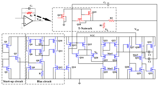 T-type topology is adopted to achieve the high resistance required by the trans-resistance structure. Among them, Q17 and Q19 are set to make Q18 obtain smaller gate voltage, and the transistor Q18 is designed as a long channel type, that is, smaller W/L. At this time, Q18 works in linear region, its resistance can reach Mega level, and its working characteristics can be guaranteed by the corresponding bias circuit. The equivalent resistance of T-type network is obtained as follows: