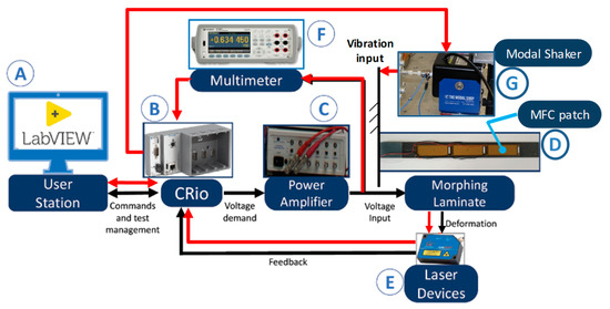 - Sensing/energy harvesting mode (see red flows in Figure 4), in which the CRio embedded controller (B) receives from the user workstation (A) the demand vibration level for the modal shaker (G) connected to the laminate attachment, and a multimeter (F) measures the voltage generated by the MFC patches (D).