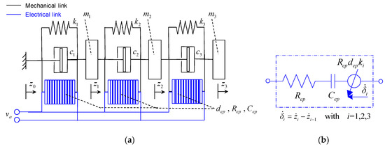 In Equations (1)–(3), is the base acceleration, zi and δi are the displacement and the bending deformation of the i-th laminate section; mi, ki, and ci are the mass, the stiffness, and the structural damping of the i-th section of the laminate; Rep, Cep, and dep are the equivalent resistance, capacitance, and piezoelectric coefficient of the patches; Ah, αh, βh, γh, and n are the Bouc-Wen model parameters; while qi, hqi, and qhi are the linear, the hysteretic, and the total charge of the i-th patch. Finally, va depending on the operation regime of the system, represents the input voltage applied to the patches or the output voltage provided by them.