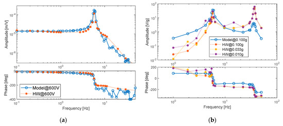 Figure 6. Model parameters’ tuning via frequency-domain responses: (a) deformation response to voltage input; (b) stored voltage response to base acceleration input. - ○