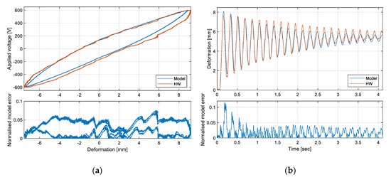 Figure 7. Validation of the model via time-domain responses: (a) hysteresis deformation loop with sinewave voltage input at 0.01 Hz; (b) deformation response to step voltage input of 300 V. - ○