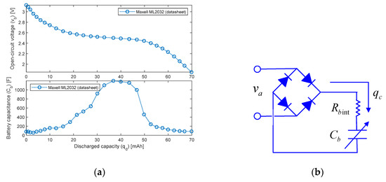 To perform the study, the open-circuit voltage characteristics (vb) of the 3V-65mAh Maxell ML2032 Li-ion rechargeable battery (Figure 8a, [55]) are used to calculate the equivalent capacitance (Cb) of the Thevenin model of the battery (Figure 8b, [56]), Equation (6):