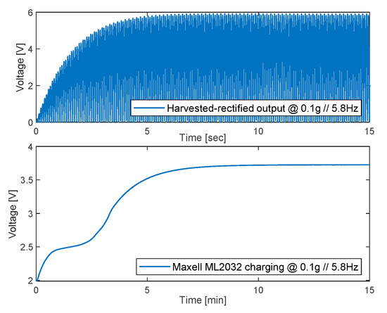 An example of the dynamics of the battery charge operated by the MFC patches is reported in Figure 9, where the simulation is carried out by imposing a 0.10 g sinusoidal base acceleration ( in Equations (1)–(3)) at 5.8 Hz (first resonance), and by assuming an internal battery resistance (Rb int) of 1 Ohm. It is worth noting that the prototype system is capable of harvesting the energy coming from the mechanical vibrations, and to restore the battery charge within 10 min (starting from a completely discharged battery, i.e., 2 V).