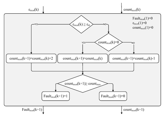 The proposed condition-monitoring logic, schematically reported in terms of flow chart in Figure 10, generates a fault flag (Faultmon, set to 1 in case of detection of detected anomalies) by elaborating the normalized model error (εmon) sampled at the monitoring frequency (fmon). If the normalized error exceeds a threshold (εth), a fault counter (countmon) is increased by 2; if the threshold is not exceeded, the fault counter is decreased by 1 when it is positive at the previous step, otherwise it is held to 0. The fault or anomaly is detected when the fault counter exceeds a pre-defined value (countmax), a parameter which basically defines the fault latency of the algorithm.