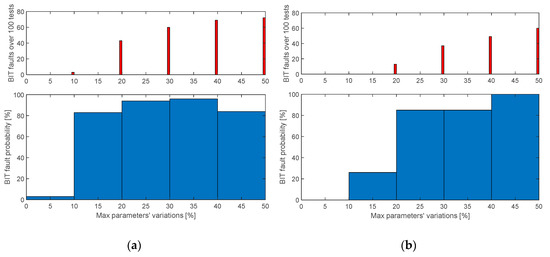 Figure 11 shows the results of the performance characterization of a condition-monitoring algorithm with the parameters reported in Table 3, by executing 100 simulations on each range of 10% deviations, in terms of number of detected BIT faults (upper plots) and BIT fault probability (lower plots) as functions of the deviation range.