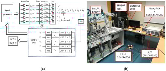 (a) Electromagnetic tracking system (EMTS) architecture; the signals produced by a signal generator are amplified, providing the excitation currents for the five transmitting coils. The total magnetic field induces a voltage in the sensor coil, which is digitalized and filtered, obtaining five RMS voltage components, , relating to the different excitation frequencies. These components are then used for the estimation of the sensor position. Moreover, five Hall effect sensors measure the excitation currents for the current control loop. (b) Experimental setup.