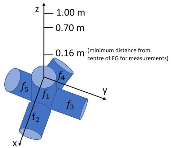 The FG is composed of five transmitting coils, arranged in space to minimize mutual coupling effects, which have been quantified in []. The transmitting coils are powered by sinusoidal currents at different frequencies (approximately 1, 2, 3, 4 and 5 kHz), according to the Frequency Division Multiplexing (FDM) technique. FDM enhances the use of time resources and does not require a synchronization device, unlike Time Division Multiplexing (TDM).