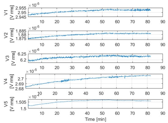 Despite the current control system, experiments have shown a significant drift of voltage components, as shown in Figure 3, representing the voltage values acquired in 82 min, after a system warm-up of about 30 min, with the sensor placed in a fixed position at 0.7 m along the z-axis.
