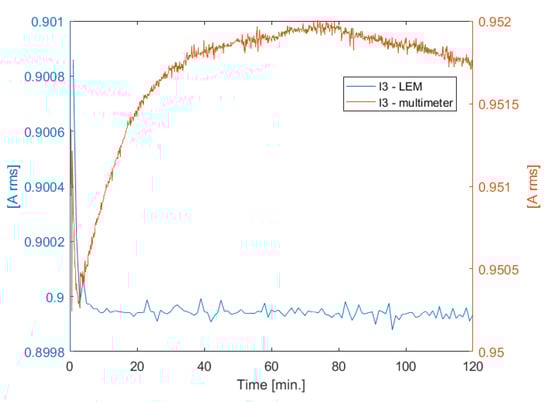 Figure 4 shows the comparison between the current measured with the Hall effect sensor and with the multimeter, related to the third transmitting coil. We can observe that the current measured with the Hall effect sensor converges after a very short time, while the current measured with the multimeter drifts over time.