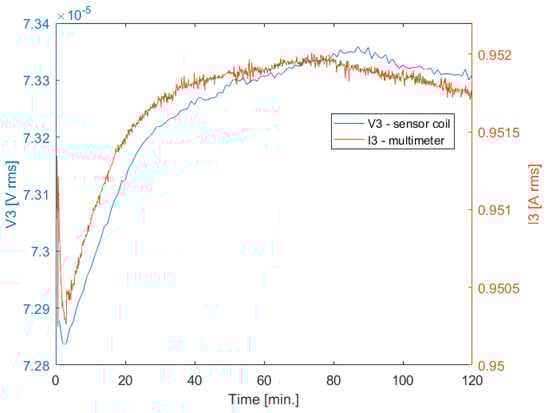 In Figure 5 we can observe that there is a correlation between the voltage drift of the sensor coil and the current drift of the field generator measured by the multimeter, which present similar behavior. We can therefore assume that the drift is due either to the Hall effect sensor, or the shunt resistor at its output, or both. In fact, the control loop varies the excitation current, in order to keep constant the current measured with the Hall effect sensor, which is affected by drift errors; hence, the measured current is stable, while the actual current drifts over time, causing a drift of the induced voltage.