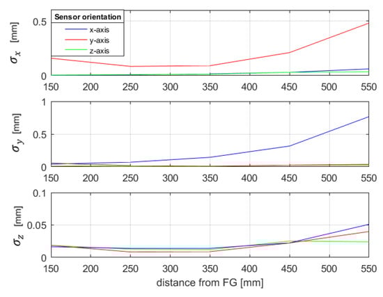 Preliminary experiments were executed to evaluate the repeatability of the system for three different sensor orientations, with its axis aligned along the x-, y-, and z-axis of the reference system of Figure 2, evaluating the repeatability in several positions along the z-axis.