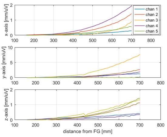 The sensor was placed in 55 different points along the z-axis, with a step of 10 mm, in the range of about 160 to 700 mm from the FG. The same test protocol of previous experimental tests was applied, thus obtaining 55 different Jacobian matrices and the corresponding components of the pseudoinverse matrices , shown in Figure 7. Basically, each component of represents the system sensitivity of a position coordinate when each voltage component changes.