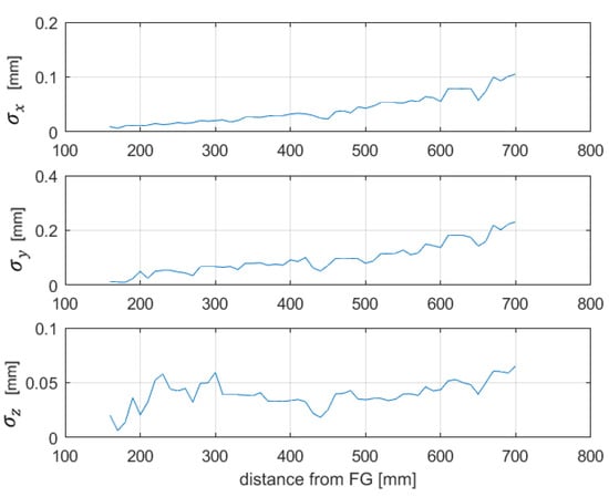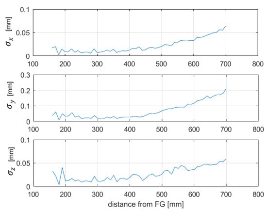 Afterwards, the position SD was estimated by means of (9). The test has been executed after a warm-up time of 1 hour. The obtained results, shown in Figure 8, show low position repeatability errors along the x-, y- and z-axis, of about 0.2 mm, within the limit suitable for surgical navigation, of about 1–2 mm in several applications [,]. Moreover, it can be noticed that the position standard deviation increased with the distance from the FG, as was expected, since the amplitude of the magnetic fields, the gradients and the signal to noise ratio of the sensor output were lower at a greater distance from the FG. This was also confirmed by the increasing behavior of the pseudoinverse observed in Figure 7. Indeed, its dependence on position allows one to evaluate, at different distances, the sensitivity of the position error to measurements errors on each channel. For example, channel 1 exhibited a lower sensitivity to errors overall. These considerations may be useful to assess the performance of the transmitting coil of the FG relevant to each channel, which is affected by its distance from the sensor coil.