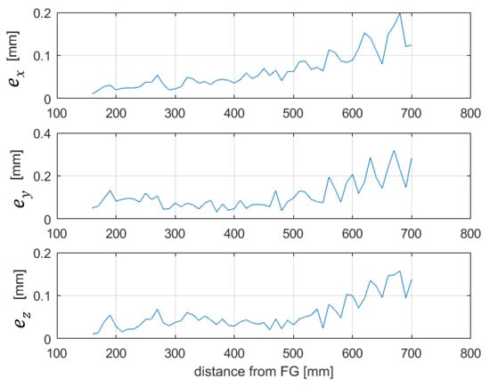 In a subsequent analysis, the repeatability error of a single sensor orientation was studied at more positions over the range, to investigate the effect of the distance from the field generator on the position repeatability. In particular, a middle orientation has been chosen, so that the axis of the sensor formed an angle of −30° in the xz-plane; in this case, it was possible to approach the condition where the orientation provided worse repeatability.