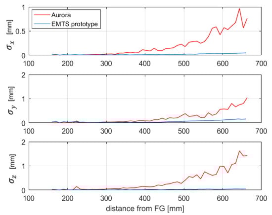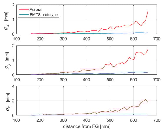 The Five DoF sensor has been placed in 51 points along the z-axis of the PFG 20-20, with a distance ranging from about 160 to 660 mm, which is the maximin distance from the FG indicated in the Aurora specifications. Figure 12 shows the SD of 100 measurements at each distance, obtained with both Aurora and the proposed system. It can be observed that the repeatability errors of the Aurora system are one order of magnitude greater than the ones obtained with the proposed system.