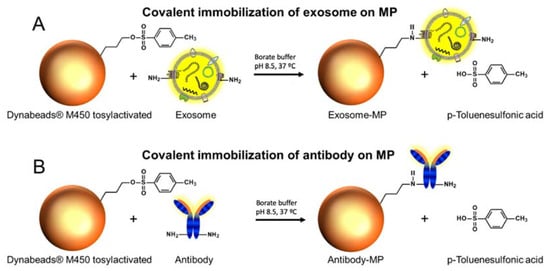 Dynabeads® M450 tosylactivated superparamagnetic particles (MPs, 4.5 µm in diameter) have a core of iron oxide salt encapsulated by a polystyrene polymer, which has a polyurethane external layer with the p-toluenesulfonate group [71]. It is a good leaving group, which allows an SN2 reaction to occur in the presence of a nucleophile [72]. A nucleophilic reaction by an antibody, protein, peptide or glycoprotein removes and replaces the sulfonyl ester groups from the polyurethane layer.