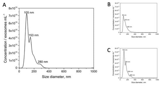 An estimation of the size diameter distribution of purified exosomes derived from the MCF-7 breast cancer cell line was performed by NTA (Figure 4). A size from 50 to 300 nm (considering 95.4% of a Gaussian distribution), but with dominance around 105 and 153 nm (60% and 34% of the counted particles, respectively) was obtained for the MCF-7 exosomes. However, it is important to highlight that NTA analysis is not able to distinguish isolated particles from aggregates. Similar results were obtained by NTA for the exosomes derived from the other breast cancer cell lines (MDA-MB-231 and SKBr3) (as depicted in Figure 4, panels B and C, respectively).