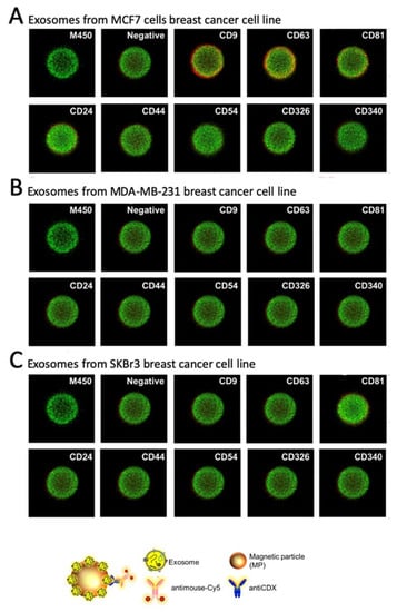 The expression of each cell line-derived exosomes was studied after the covalent immobilization on MPs (Figure 2, exosomes-MPs and Figure 6, panel A for exosomes derived from MCF7, panel B for MDA-MB-231 and panel C for SKBr3 cells lines). The intense green color of the magnetic particles is due to autofluorescence around 580 nm [77]. As expected, general tetraspanins (CD9, CD63 and CD81) [78,79] were expressed in exosomes from the MCF7 breast cancer cell line (Figure 6, panel A). The biomarkers related to breast cancer are weekly or not expressed. Negligible non-specific adsorption fluorescence was observed (Figure 6, negative control), indicating a good blocking procedure of the remaining tosyl-activated group after covalent immobilization.