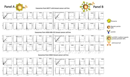 The analysis of the molecular biomarkers CD9, CD24, CD44, CD54, CD63, CD81, CD326 and CD340 expressed in the exosomes derived from three different cancer cell lines (MCF7, MDA-MB-231 and SKBr3) was performed by flow cytometry. Accordingly, for the labeling of cell-derived exosomes, they were firstly immobilized on the surface of MPs by two different approaches, as described above (Figure 2). In Figure 2, panel A depicts the covalent immobilization of the 3.5 × 1010 exosomes on 1.6 × 107 MPs (exosomes-MPs). The exosomes-MPs were analyzed by indirect labeling by incubation with 100 µL (5 µg mL−1) of the antibodies antiCDX (mouse), (CDX being either CD9, CD24, CD44, CD54, CD63, CD81, CD326 or CD340 biomarkers), for 30 min with gentle shaking at 25 °C. After that, three washing steps with PBS pH 7.5 0.5% BSA were performed. Afterwards, 100 µL (2 µg mL−1) of antimouse-Cy5 antibody (a far-red-fluorescent dye, excitation 647 nm, emission 665 nm) was incubated for 30 min at 25 °C. The labeled exosomes-MPs were resuspended in PBS pH 7.5 0.5% BSA. In Figure 1, panel B, 1 × 106 MPs modified with rabbit antiCD81 (antiCD81-MPs) were incubated with 4 × 109 exosomes (1:4000 MP/exosomes ratio). Exosomes immunocaptured by antiCD81-MPs were detected using indirect labeling, as described above.