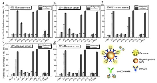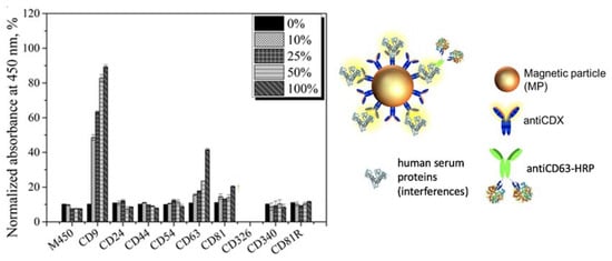The evaluation of the matrix effect was firstly performed by immunomagnetic separation (IMS) of MCF7-derived exosomes spiked in 0% (10 mmol L−1 phosphate-buffered saline (PBS) (no serum)), 10%, 25%, 50% and 100% (undiluted) exosome-depleted human serum (obtained as schematically shown in Figure 1, panel B). The IMS was performed by antiCDX-MPs (CDX being either CD9, CD24, CD44, CD54, CD63, CD81, CD326 or CD340 biomarkers), followed by a direct labeling and optical readout. The procedure for the magneto-actuated immunoassay was previously described in detail by our research group [17]. To summarize, this approach involved a direct immunoassay format, and in all cases was performed in 96-well microtiter plates. The direct immunoassay format involved the following steps: (i) IMS of the exosomes with antiCDX-MPs. The antiCDX-MPs (CDX being any of CD9, CD24, CD44, CD54, CD63, CD81, CD326 or CD340 biomarkers) (containing 1 × 106 antiCDX-MPs per well) and the exosomes (4 × 109 exosomes per well spiked in 100 μL of any of the matrix: 0%, 10%, 25% or 50% diluted and undiluted human serum), were simultaneously incubated for 30 min with shaking at 25 °C, followed by three washing steps with PBS containing 0.5% BSA. (ii) Direct labeling. The exosomes-coated MPs were incubated with the antiCD63-HRP antibody (100 μL, 1.24 µg mL−1) for 30 min with shaking at 25 °C, followed by three washing steps with PBS containing 0.5% BSA. (iii) Optical readout. 100 μL of substrate solution (0.004% v/v H2O2 and 0.01% w/v TMB in citrate buffer) was then added to each well and incubated for 30 min under dark conditions. The enzymatic reaction was stopped by adding 100 μL of H2SO4 (2.0 mol L−1). Then, exosomes-MPs were separated using a magnet plate separator, and an exosomes-MPs pellet formed on the bottom tube, followed by supernatant separation. The absorbance measurement of the supernatants was thus performed with the microplate reader at 450 nm. After each incubation or washing step, a 96-well magnet plate separator was positioned under the microtiter plate until the pellet formation on the bottom corner, followed by supernatant separation.