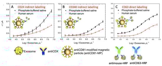 The results show the performance of the magneto-actuated electrochemical immunosensor for the detection of exosomes spiked on PBS (10 mmol L−1) and on human serum (exosome-depleted), and performed by IMS on antiCD81-MPs and the detection of cancer-related biomarkers (CD24 and CD340 for Figure 10, panels A and B, respectively).