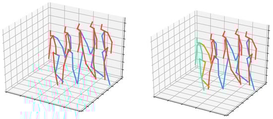 Skeleton visualization of a walking motion, and the anticipated frame of the full skeletonskeleton frame for 2 s of input motion length and 0.4 s of anticipation time. (Left) ground truth motion, i.e. the red-blue frames are recorded. (Right) initial motion segment and anticipated motion, the red-blue frames are from the recorded initial segment, the green-orange frame is the skeleton frame of the 17 markers anticipated by DMDd80.