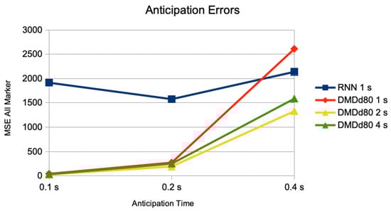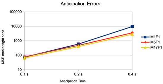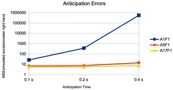 In Figure 3, the results of the anticipation error of just the marker of the right hand is given. The anticipation error of performing the DMDd80 on the time series of just this one marker is given as M1F1. The error of this one marker but using DMDd80 on the end effectors and the root is given as M5F1; the one performing DMDd80 on all 17 markers is given as M17F1. Using second derivatives as simulation of accelerometer sensor data are given similarly as A1F1, A5F1, and A17F1. Whereas the addition of a “spatial context” of other markers than the one measured for anticipation in the DMDd computation has little effect for 0.1 s of anticipation time, there is a considerable effect for 0.2 s of anticipation time, and a huge effect for 0.4 s of anticipation time: For the simulated accelorometers the corresponding results are given in Figure 4. The average MSE of the right hand marker’s accelerations with a value of 553,000 was about four orders of magnitude larger when performing the DMDd only on its time series compared to the one using the spatial context of the 4 additional ones (left hand, left and right foot, and root) with a value of 14. Considering more than 4 additional markers had little additional effect.
