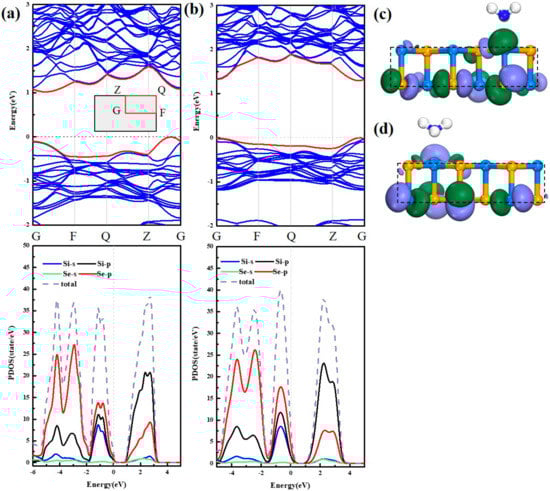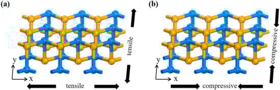 - Mao, Y.L.; Ben, J.; Yuan, J.M.; Zhong, J.X. Tuning the electronic property of two dimensional SiSe monolayer by in-plane strain. Chem. Phys. Lett. 2018, 705, 12–18. [Google Scholar] [CrossRef]