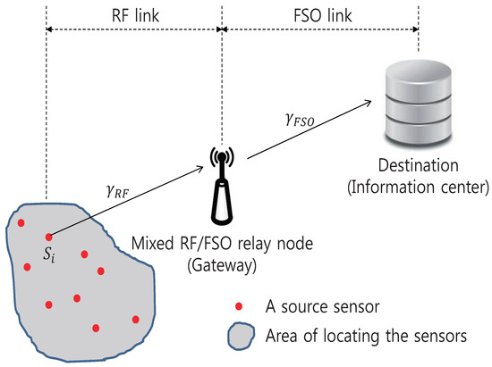 We consider an asymmetric dual-hop mixed RF/FSO AF relaying communication system where a source sensor (S) and a destination data center (D) are communicating through an intermediate relay node (R) (as in Figure 1). We assume that S-R link is RF and R-D link is FSO (FSO/RF link also can be similarly treated with the following analysis). This model is applicable to any sensor-network scenario that consists of low-power RF link among remote sensors (or terminals) and mid/long-distance FSO-relaying link between an intermediate cluster head (or gateway) and an information sink. In Project Loon, for an example, hot air balloons are connected using FSO mesh links to provide LTE-level internet services to infrastructure-poor areas [15]. Airborne weather sensors linked by RF in a balloon also can be connected to an information center on the ground using FSO link.