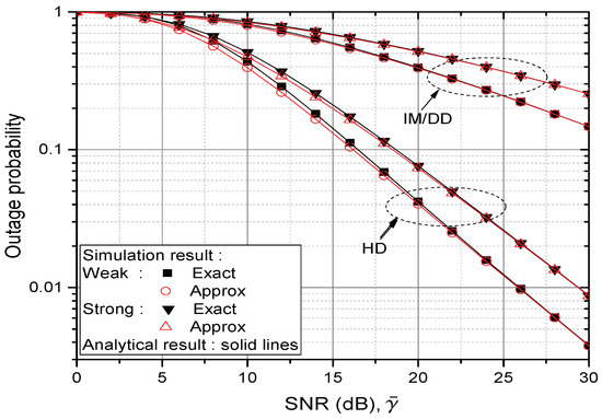 Figure 2 and Figure 3 verify the analytical result on the CDF of (equivalently, OP performance) by comparing it with the simulation result. Different pointing error assumptions and 6.7 are used in Figure 2 and Figure 3, respectively. In both of the Figures, it is seen that the analytical result is exactly matched with the simulation. In the Figures, the gap between “Exact” and “Approx” result reveals the effect of noise amplification. It becomes large when the test environment changes from high to low SNR, from IM/DD to HD, from strong to weak turbulence and from high to low pointing error assumption, respectively. At SNR 10 dB, the degradation in OP due to the noise propagation is about at HD receiver in weak turbulence environments in Figure 2. It diminishes to in strong turbulence but increases to in Figure 3 where lower pointing error is assumed. If IM/DD receiver is considered, the above three percentages reduce to , and , respectively. If the SNR is greater than 30 dB, the gap in every tested point becomes less than .