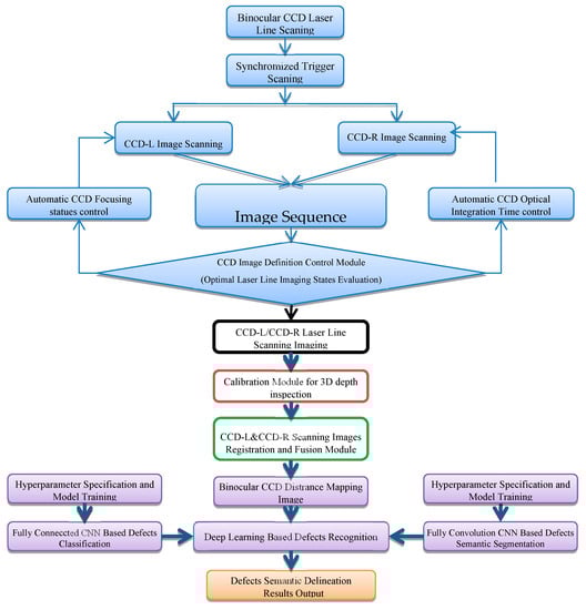 To implement the deep learning 3D inspection method and create a reliable detection system to meet the special requirements, we devised an improved experimental system based on our previous research. Figure 5a is the schematic principle of the devised binocular CCD laser image scanning system. Figure 5b is the corresponding experimental system devised that we updated from our previous multi-source CCD imaging system in the literature []. The previous system mainly utilized the traditional inspection methods, and the 3D laser scanning system just played auxiliary role in defect location. In the new 3D-LDS system, the integrity of defects can be captured properly without the line scanning CCD. In this system, we employed two MERCURY CCD cameras (model: MER-500-14GC-P) and the lens model selected was M0814-MP2. Here, the deep learning defects recognition process was conducted on the fusion image from the two imaging sensors. In this system, the two laser scanning images were overlaid informatively by a registration method and this process is a rigid transformation of rotation and translation. Once the system calibration was completed, the imaging parameters between the two CCD cameras were settled. Notice that the applicability of the proposed experimental system is not tied to CC products surface defects inspection exclusively.