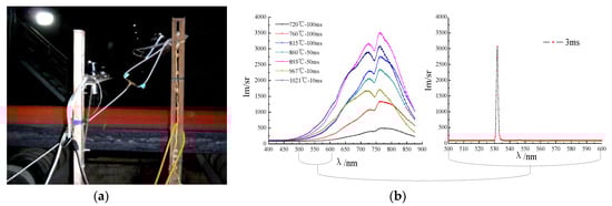 The spectral radiation intensity at different temperatures in slab surface and light intensity distribution of the laser stripe. (a) High temperature spectrum measurement; (b) Spectral intensity comparison.