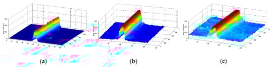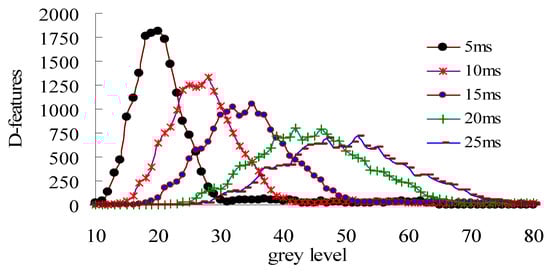 In image-based ROI inspection methods, it is a prerequisite for the imaging sensor to be able to capture objects informatively and adjust imaging parameters adaptively as the peripheral environment changes. Therefore, the 3D-LDS as a structured light assistant active imaging system needs a laser stripe with a maximal color contrast and the most homogeneous gray-level. Namely, the imaging sensor should be set to an appropriate optical integral time (OIT) and focus status. When it comes to a rigid system architecture, the focus status can be fixed as the imaging distance and imaging depth of field (DOF) are constants. However, the automatic OIT controlling method needs to be focused on if imaging sensor works in an unstable high-temperature radiation environment. According to the Planck theorem [], we took the CC production as an blackbody and assumed that its surface emissivity is equal to 1. While T > 500 ℃ (like the CC slab roughly varied between 600 ℃ to 900 ℃ when it comes out of the second cooling area), the visible red-light radiation can be sensed by unaided eyes. We tested the optical spectrum radiation interference in different temperatures in hot CC slab surface from 720 ℃ to 1021 ℃, as in shown in Figure 2. We can observe the regular patterns of light strength distribution with different OIT and object surface temperatures. The experiments present a quantitative guidance for determining laser luminous wavelength and controlling the imaging sensor’s parameters. In 3D-LDS, to minimize radiation interference, we selected a 532 nm green laser emitter. On the one hand, it can ensure that the CCD sensor is in the imaging spectral sensitive range and on the other hand, it can avoid high-temperature radiation interference as much as possible. We can observe that the radiation intensity of the laser stripe at 3 ms is easily distinguishable from the hot slab surface (1000℃) at the integral time of 10 ms.